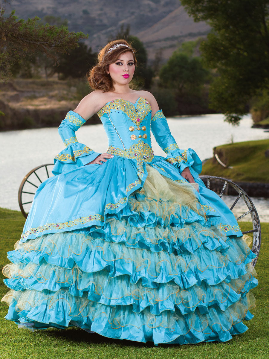 Vestido De Quinceañera Joanini Ch-03 100% Poliester Azul Turqueza/Oro 600019